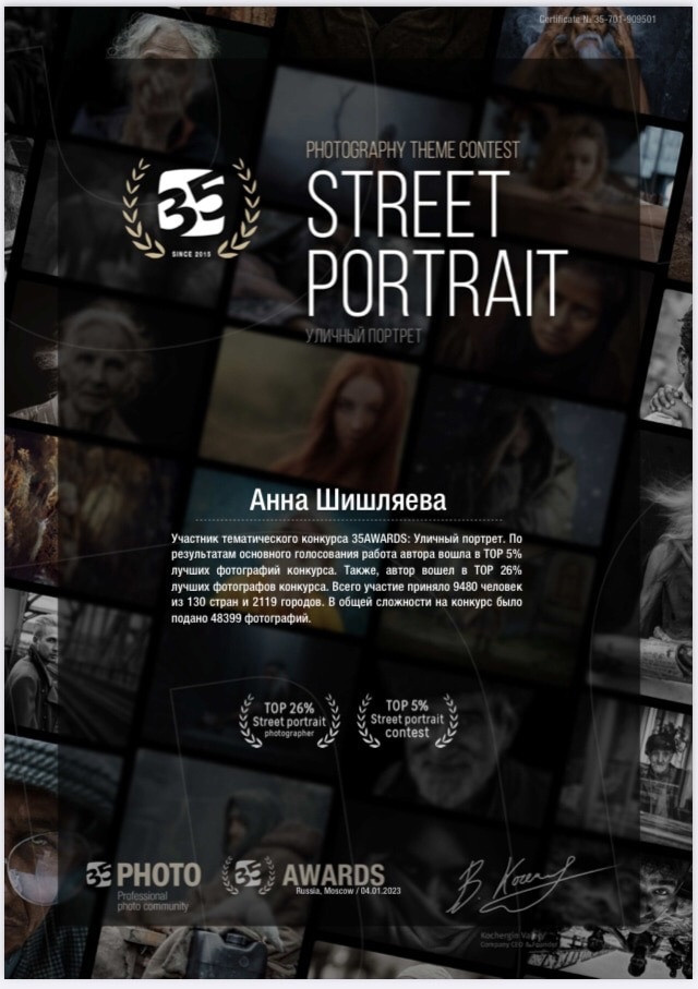 Получила ещё одну награду в международном конкурсе 35AWARDS, в номинации «Уличный портрет».